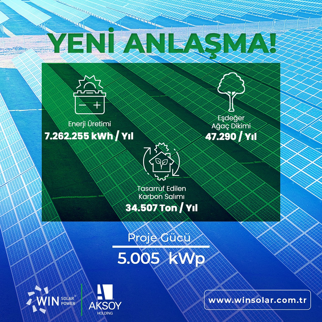 Win Solar, Aksoy Holding ile toplam 5.005 kWp'lik güneş enerji santrali projesi için anlaşma yaptı.